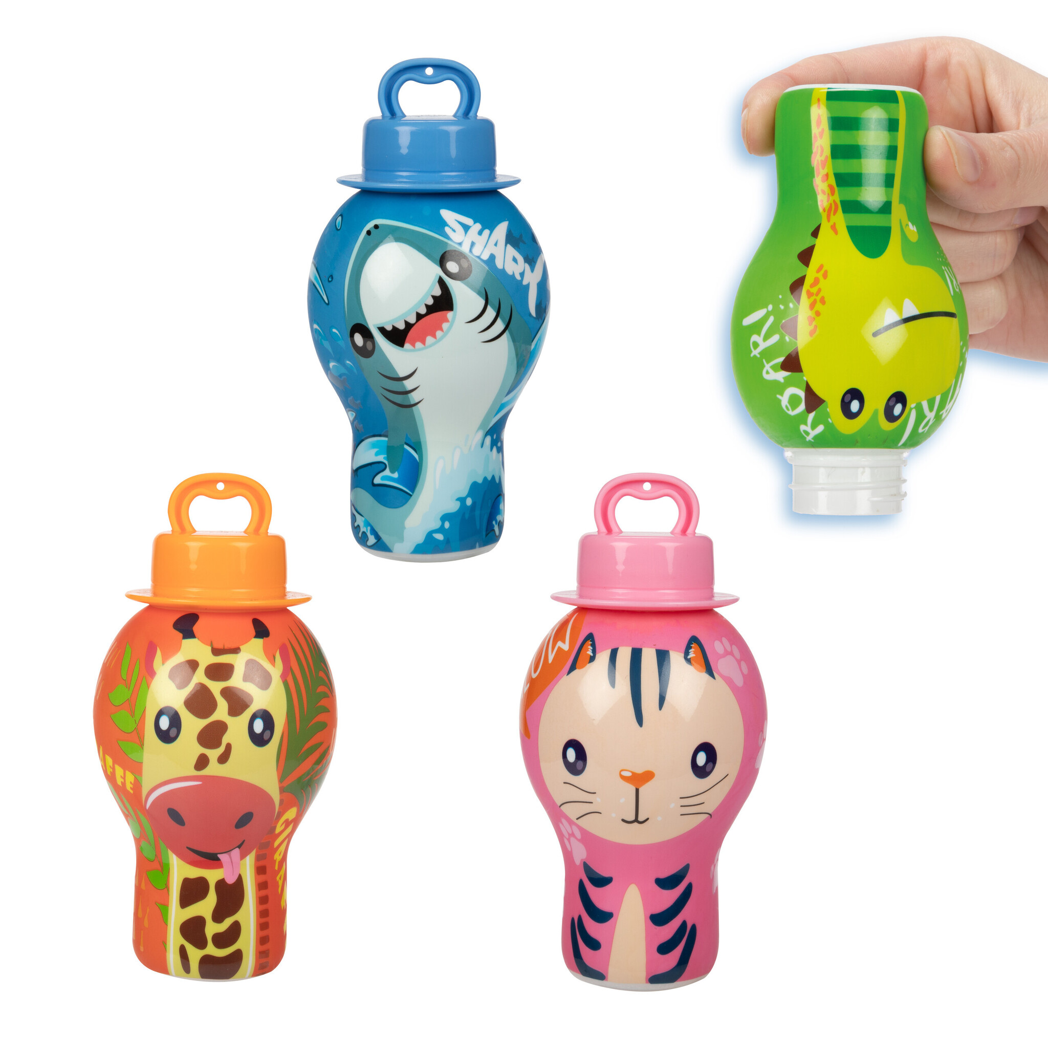 Laat kinderen onbezorgd spelen met deze vrolijke bellenblaas! Dankzij de speciale anti-knoei verpakking blijft de vloeistof netjes in het potje, ook als het omvalt. Versierd met leuke dierenafbeeldingen, ideaal om de fantasie te prikkelen.