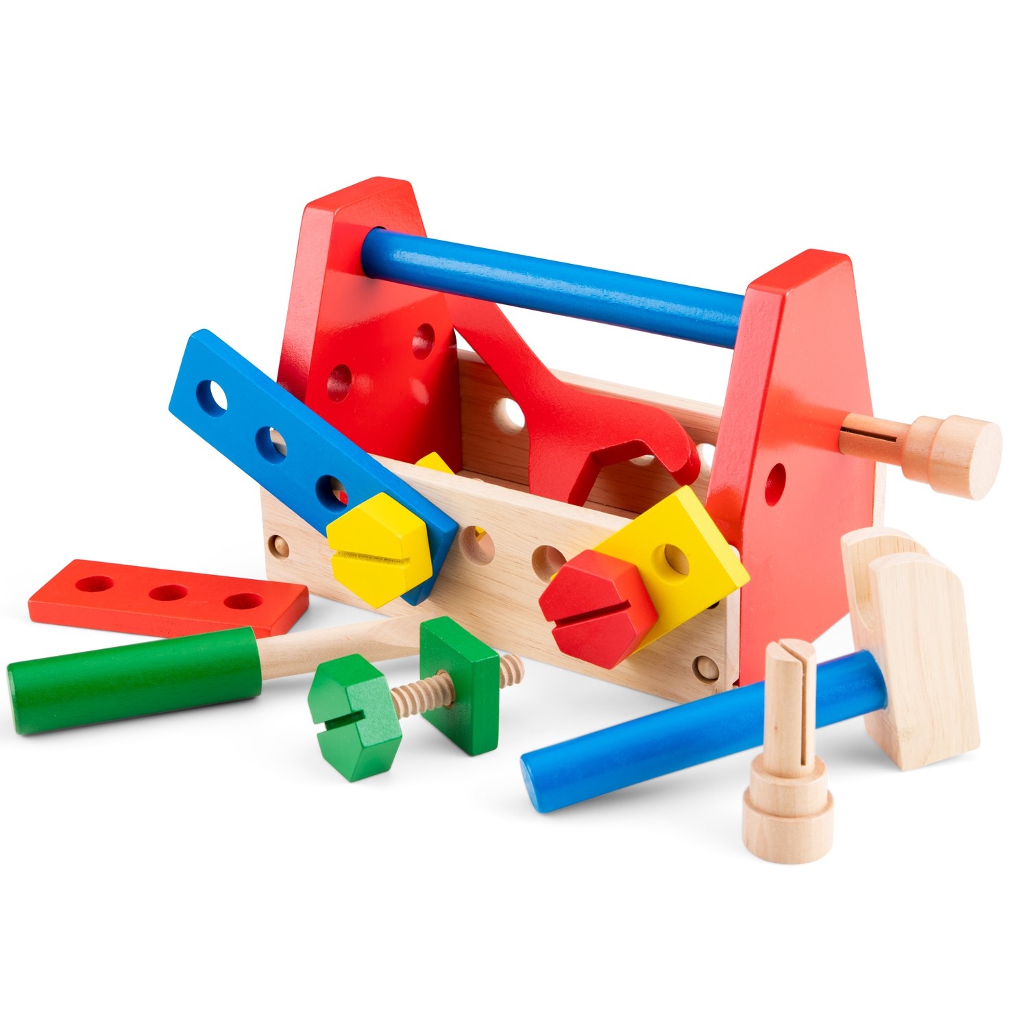 Een goed gevulde gereedschapskist voor de kleine klusser! Bevat: hamer, moersleutel, schroevendraaier, drie verbindingsplaatjes, twee spijkers, drie moeren en drie bouten.