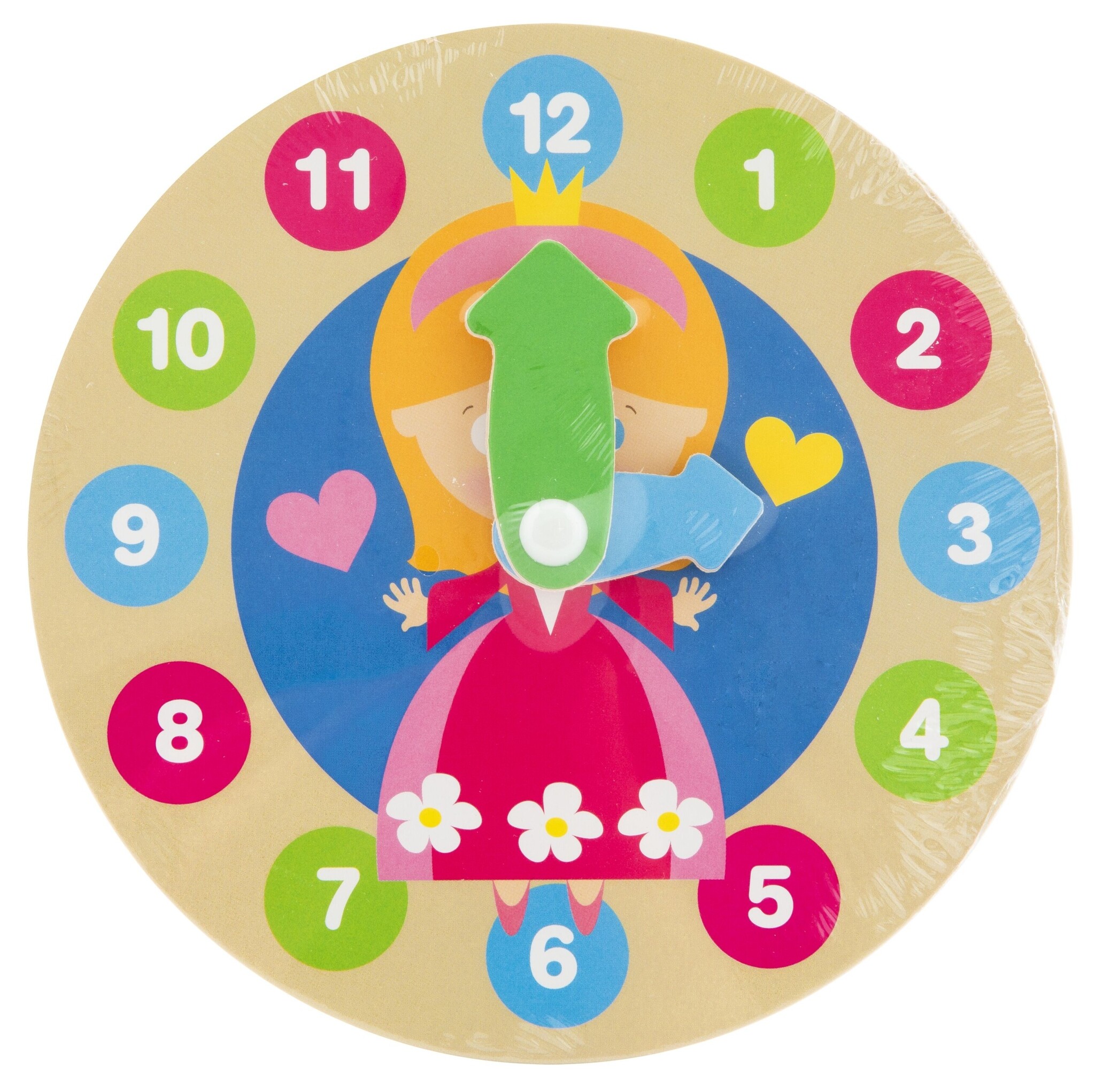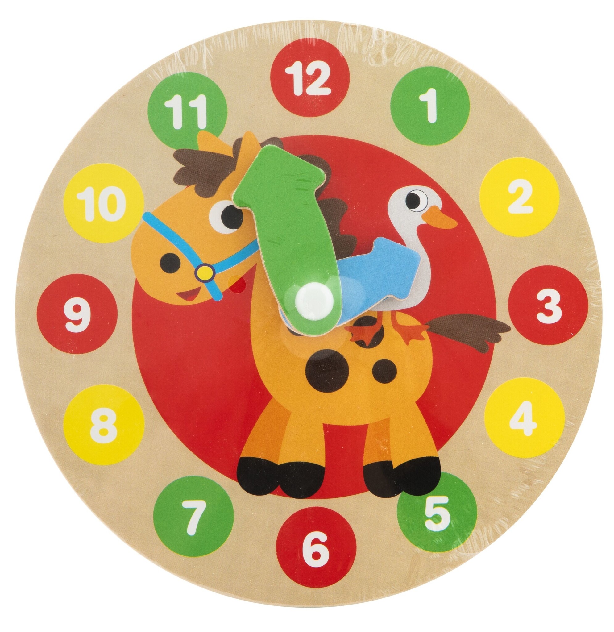 Leer de tijd op een leuke manier met dit vrolijk bedrukte houten klokje. Met draaiend uurwerk! Assorti designs geleverd. Diameter: 14 cm. Geschikt vanaf 3 jaar.