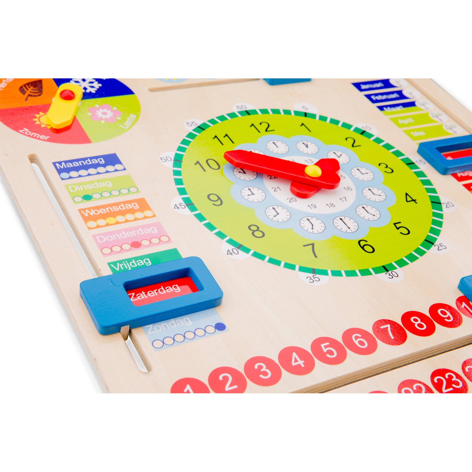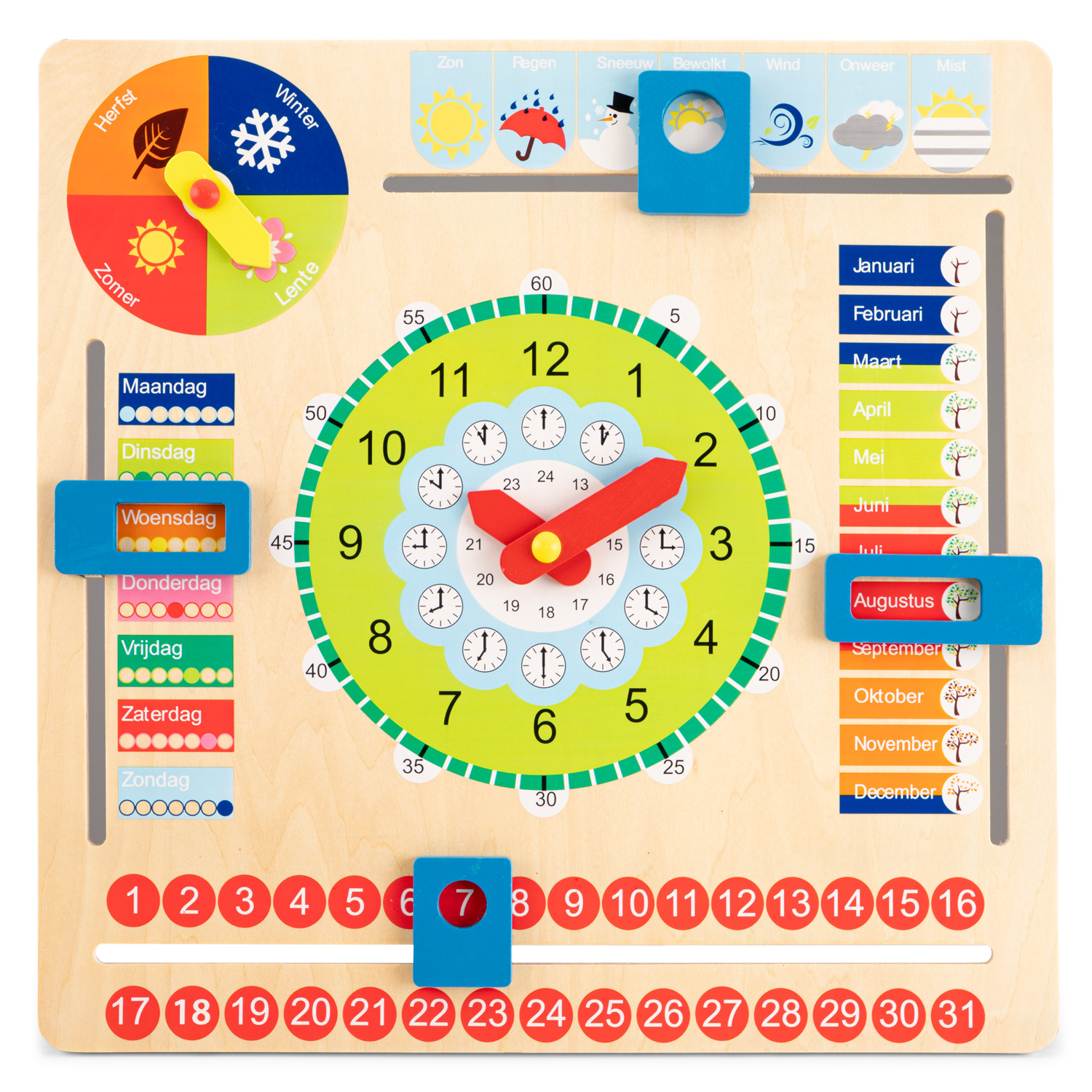 Een mooie houten kalenderklok. De klok helpt kinderen de datum en tijd te leren. Met behulp van de schuifjes en de draaibare wijzers kan de dag, de datum, de maand, het seizoen en zelfs het weer aangegeven worden.