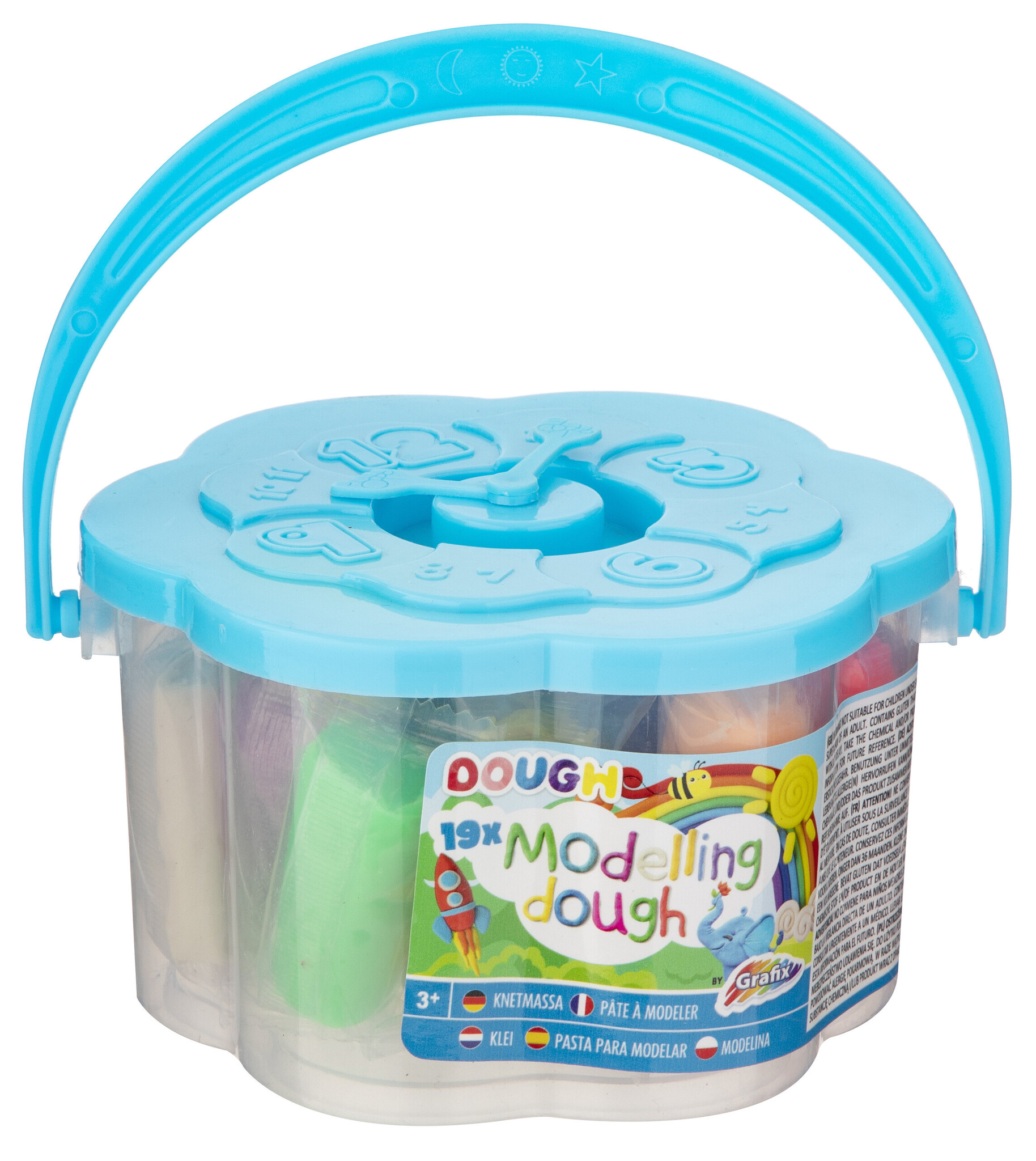 Een vrolijk emmertje met een klokje in de deksel (het wijzertje draait écht!) en daarin maar liefst 19 staafjes kleurrijke, ingepakte klei. Assorti kleuren geleverd. Afm. emmertje: 12 x 11,5 cm. Geschikt vanaf 3 jaar.
