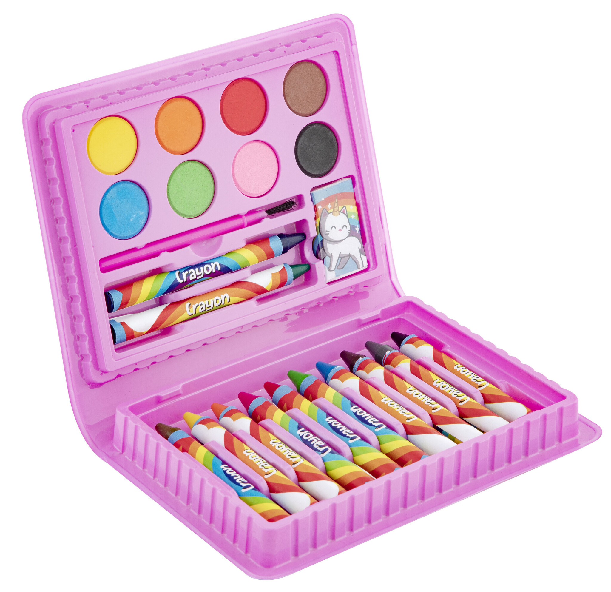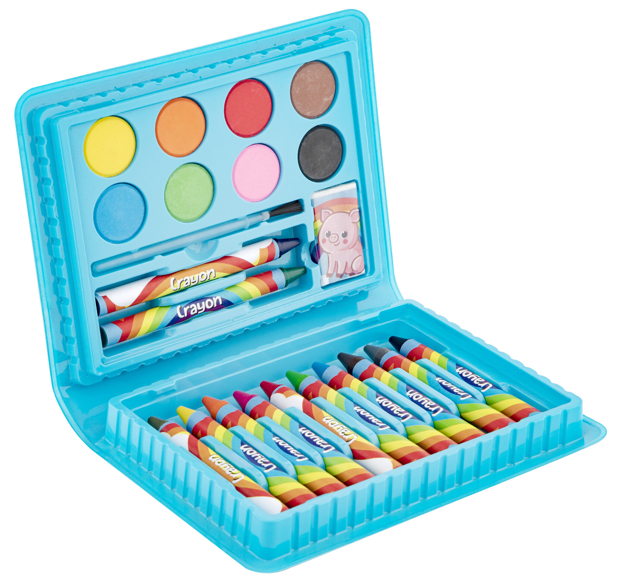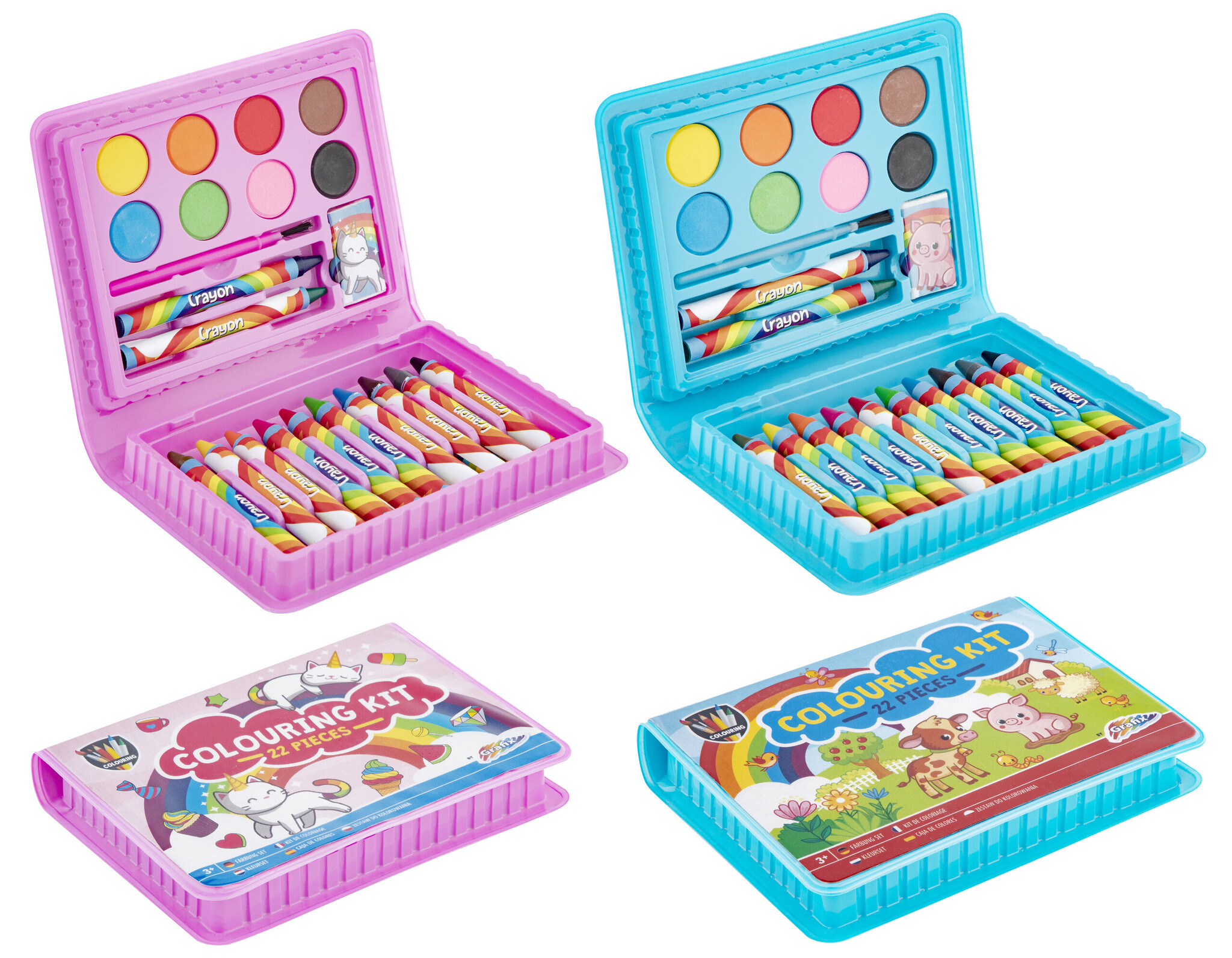 De kit is 22- delig en bevat waskrijtjes, verf, een penseeltje en een gum.