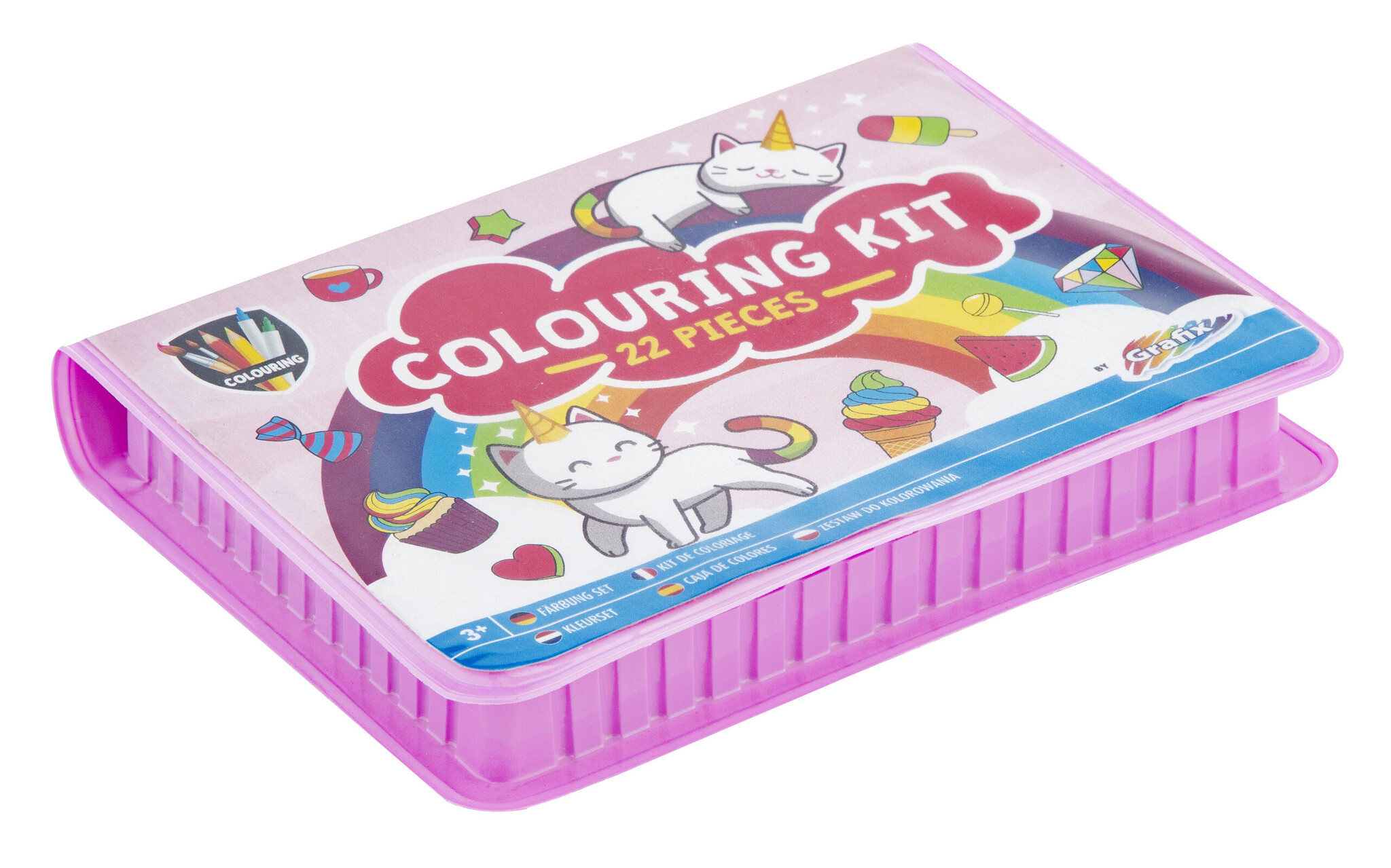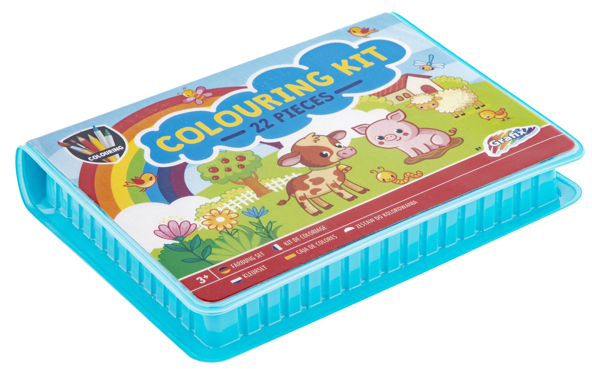 Leef je lekker creatief uit met de kleurtjes uit deze handige kleurkit! De kit is 22- delig en bevat waskrijtjes, verf, een penseeltje en een gum. Afm. ca. 10 x 14 cm. Geschikt vanaf 3 jaar.