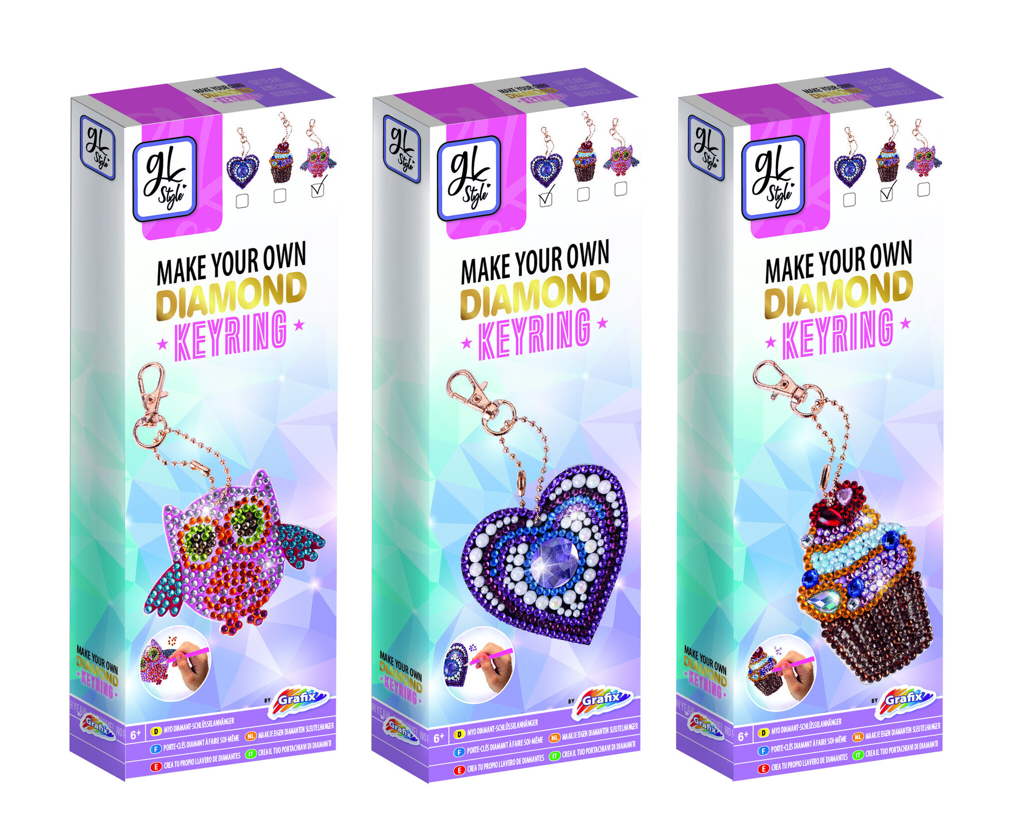 De hit van dit moment! Middels kleine diamantjes een sleutelhanger versieren. Assorti figuren geleverd. Afm. verpakking ca. 14 cm.