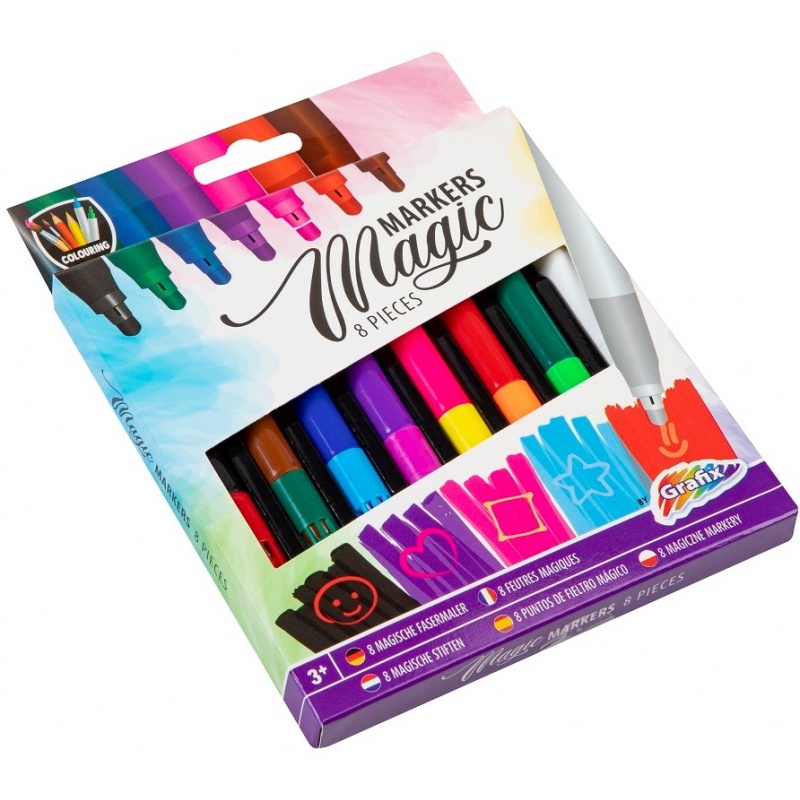Kleur en gebruik de toverstift om andere kleuren tevoorschijn te toveren! Het lijkt wel magie! Doosjes bevat 8 stiften. Geschikt vanaf 3 jaar.