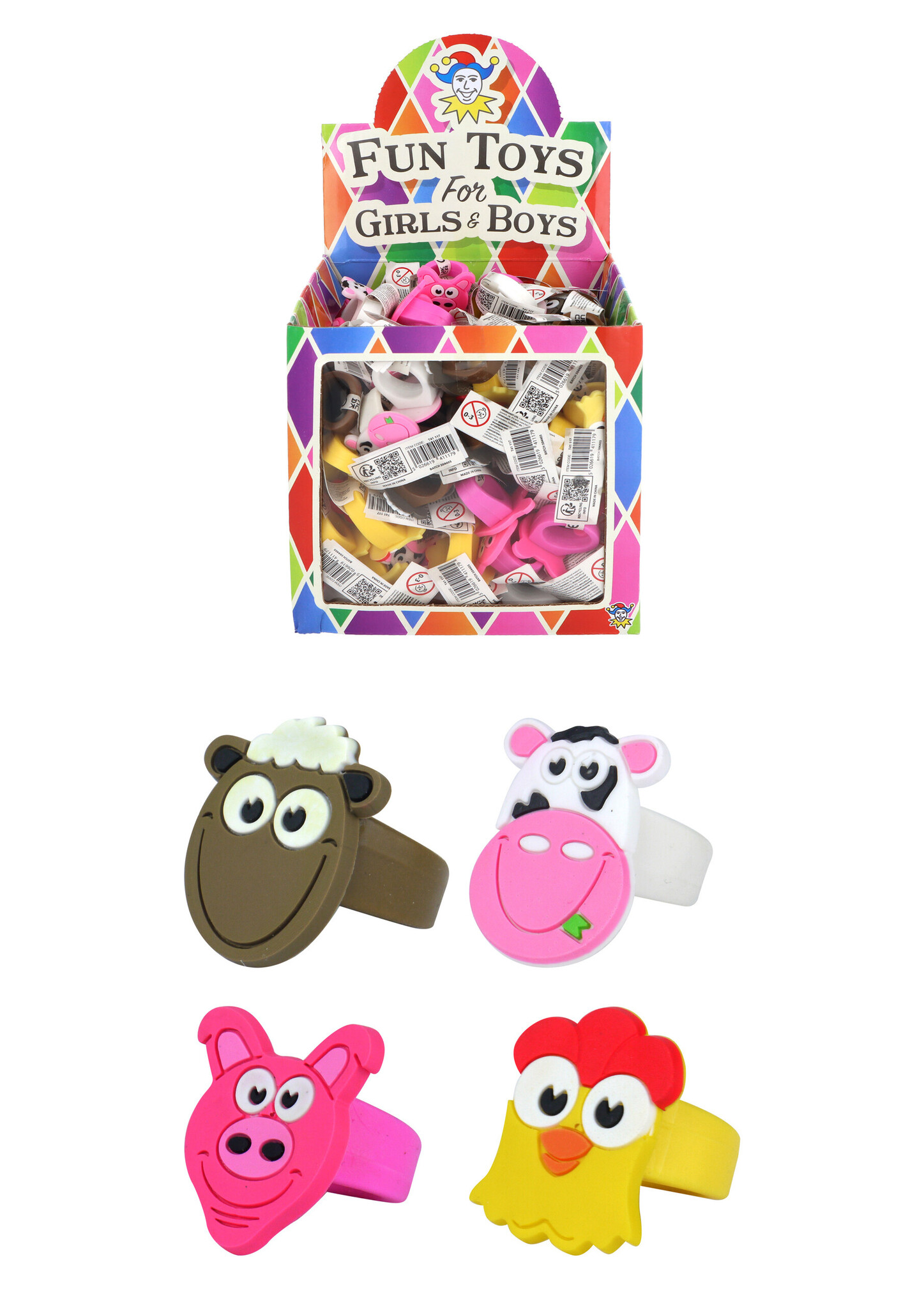Vrolijke ringen met boerderijfiguurtjes! Ca. 2 x 3 cm groot en geleverd in leuke assorti modellen.